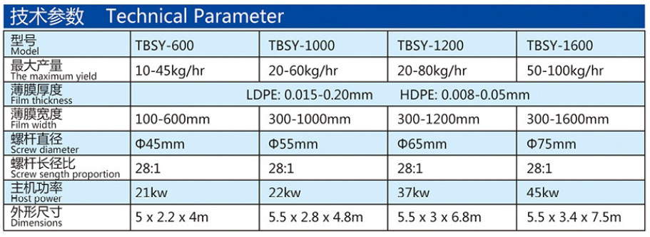 機(jī)器特性 吹制各種規(guī)格的低密度聚乙烯、高密度聚乙烯和線性低密度聚乙烯塑料薄膜,廣泛應(yīng)用于食品百貨、日用、化工、針紡品、購(gòu)物禮袋和工業(yè)包裝。機(jī)簡(jiǎn)、螺桿采用38CrMoAl合金材料經(jīng)氮化處理精密加工而成